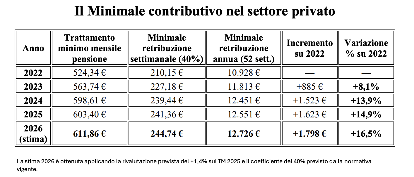 Dal 2022 al 2026 il minimale contributivo settimanale cresce del 16,5%, ben più dell’andamento delle retribuzioni. Questo disallineamento significa che, anche lavorando 12 mesi, un dipendente con redditi bassi può vedersi riconosciute solo una parte delle settimane utili.